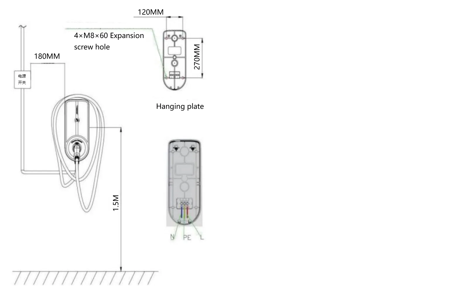 1) زمین سے چارجنگ پائل کی اونچائی کا حوالہ ڈیٹا (1.3-1.5 میٹر)2) دیوار پر پچھلی پلیٹ پر بڑھتے ہوئے سوراخ کی پوزیشن کو پچھلی پلیٹ پر بڑھتے ہوئے سوراخ کی پوزیشن کے مطابق نشان زد کریں۔